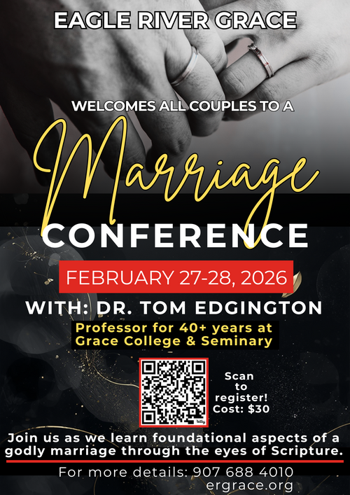 Our sister church in Eagle River is hosting a marriage conference with special speaker, Dr. Tom Edgington, from Grace College and Seminary. Scan the QR code to register.