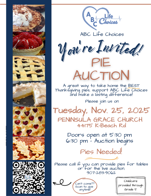 You are invited to the ABC Life Choices Pie Auction, which helps support and empower women and families so that they can make life-affirming decisions.  Doors open at 5:30pm on November 25th.
